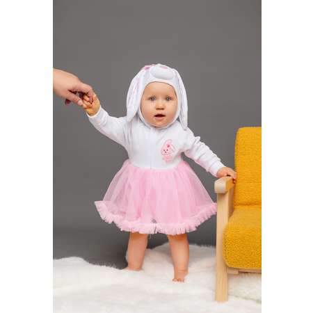 Карнавальный костюм Зайки для самых маленьких. Очаровательный комбинезон-боди с ушками и юбочкой для девочек. Материал - натуральный хлопок. Расцветка бело-розовая. Особенности: Застежка-молния спереди Ушки и мордочка зайки на капюшоне Аппликация с зайкой на груди Юбка пышная розовая