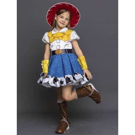 Костюм Ковбойши Джесси детский - новый образ, который представляет героиню мультфильма История Игрушек. Комплект костюма включает блузку, юбку, пояс, шляпу, сапоги. Особенности: Белая блуза с отложным воротничком Короткие рукава-фонарики Юбка под джинс широкая пышная Оборка с пятнистым принтом по подолу Мягкие сапоги, имитирующие кожаные ковбойские Красная ковбойская шляпа