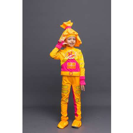 Карнавальный костюм Симки из семейства знаменитых Фиксиков понравится любой девочке, симпатизирующей этому мультсериалу. Симка является главной героиней мультика, отличается умом и решительным характером. Костюм Симки выполнен в ярко-оранжевой расцветке. В комплект входит куртка, брюки, ботинки и шапка. Особенности: Куртка ярко-оранжевая со значками спереди Рукава заканчиваются красными перчатками без пальцев Брюки облегающие на резинке Ботинки мягкие объемные Головной убор в виде прически Симки