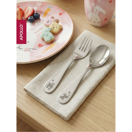 Набор детских столовых приборов Apollo создан для перехода малышей к самостоятельному питанию. В комплект входит вилка и ложка, разработанные с учетом особенностей детской руки. Их уменьшенные размеры, сбалансированный вес и форма ручки позволяют ребенку легко их удерживать и контролировать движения во время еды. Это способствует развитию мелкой моторики и координации.