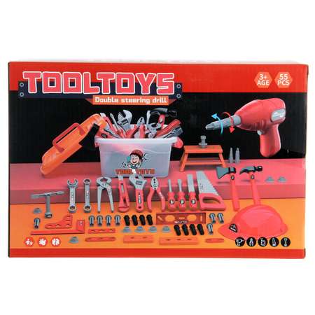 55 предметов. Полимер. Шуруповерт работает от 2 батареек АА, в комплект не входят.