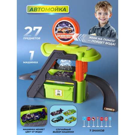 Игровой набор автомойка с металлической машинкой. При воздействии воды корпус машинки будет менять цвет, в помпу накачивается вода, машинка устанавливается на площадке, при нажатии на помпу вода будет литься на машинку, процесс помывки автомобиля. Дорожные знаки в наборе, крутящаяся щетка автомойки, 2 горки для скатывания машинки. Оригинальная задумка, прочные и долговечные материалы, компактные размеры.