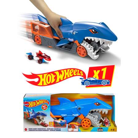 Культовый автомобиль Shark Bite от Mattel теперь представлен в виде шикарного грузовика под названием Голодная акула! Когда автовоз движется вперед, акула захватывает машинки своими челюстями и проглатывает их. Машинки хранятся в животе чудовища, а выгрузить их можно через заднюю часть с помощью пандуса. Внутри можно разместить до 5 автомобилей (дополнительные автомобили продаются отдельно).