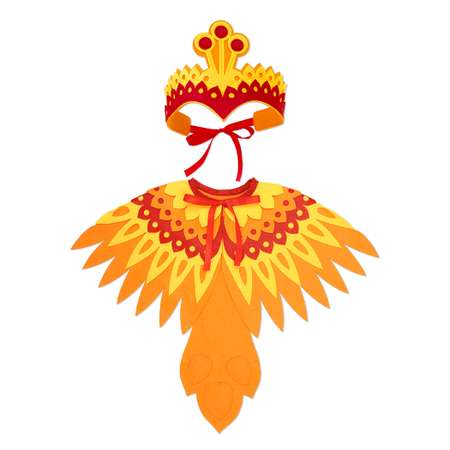 Роскошная корона с перьями из фетра и яркая многослойная накидка с градиентом цветов — от алого до ярко-желтого, создадут образ волшебной Жар-Птицы, которая станет королевой любого праздника.