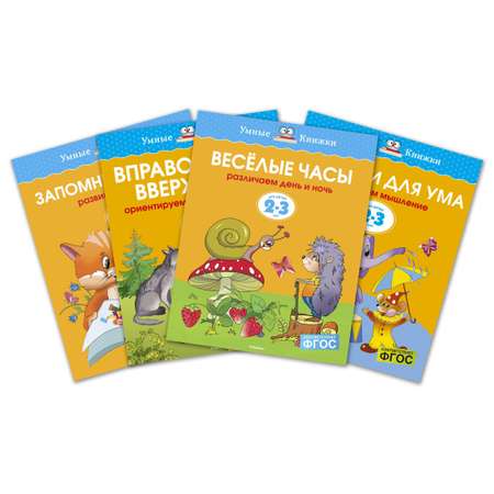 В комплект входят книги «Веселые часы (2-3 года)», «Вправо-влево, вверх-вниз (2-3 года)», «Задачки для ума (2-3 года)» и «Запомни картинки (2-3 года)».