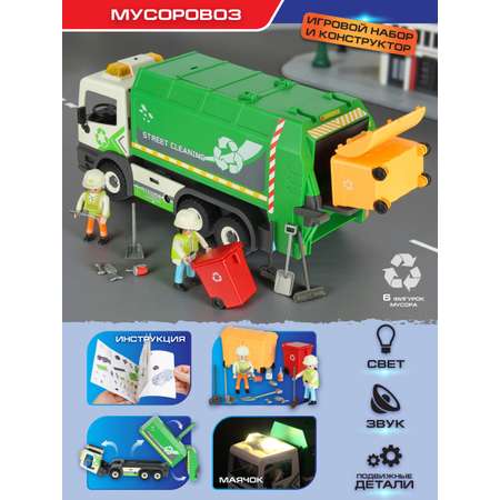 Конструктор мусоровоз с подсветкой, звуковыми эффектами и множеством аксессуаров. Машина катается вперёд и назад, прорезиненные колёса и боковые зеркала, подсветка проблесковых маячков на крыше, звук заводящегося мотора, поднимающаяся дверца на крыше кузова, несущая плита открывается, приемный бункер поднимается, в кузов можно поместить мусор. У фигурок дворников двигаются руки и ноги, головы крутятся, в руки можно вложить уборочное снаряжение, у мусорного бака и контейнера поднимаются крышки. Игровой набор изготовлен из прочных и безопасных материалов в качественном исполнении с вниманием к деталям.