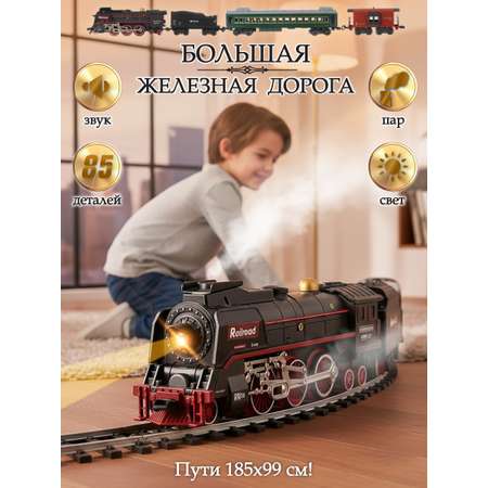 Шикарный игровой набор железная дорога с поездом. Локомотив с паром из трубы и колес, красивой подсветкой носового фонаря и трубы, звуковыми эффектами, движением вперед и назад. Плавный разгон, как у настоящего локомотива. Вагон с подсветкой, работа от заряжаемого аккумулятора, 2 вида управления локомотивом, с помощью пульта и кнопок на корпусе. Пульт управления сделан в виде дополнительного вагона, можно подсоединить к составу. Легкая сборка железной дороги, изменение направления движения состава с помощью перевода стрелок, общая подробная инструкция на железную дорогу и состав, подробная инструкция на пульт управления, бутылочка в наборе. Отличное качество исполнения, прочные и долговечные материалы, внимание к деталям, реалистичная модель локомотива, выполненная в ретродизайне. Благодаря подсветке можно играть в темное время суток. В наборе детали для сборки железной дороги 74 штуки, локомотив, 3 вагона, пульт управления, 2 дерева, бутылочка для воды, USB кабель, крестовая отвертка, аккумулятор 3.7V, подробная инструкция на английском языке.