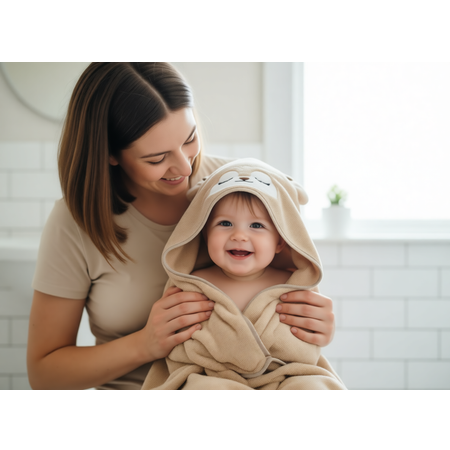 Детское полотенце с капюшоном подходит как новорожденным малышам, так и детям до 10 лет. Размер банного полотенчика 105*105 позволяет укутаться ребенку любого возраста.
