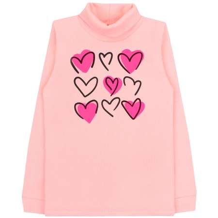 Розовая детская водолазка из 100% хлопка с принтом в виде сердечек на груди, с длинными рукавами и высоким воротником.