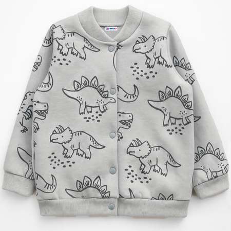 Детская толстовка-бомбер серого цвета с принтом в виде динозавриков. Модель на кнопках, с манжетами и поясом в рубчик. Изготовлена из футера трехнитки с начесом (хлопок). Доступна в размерах 92-116.