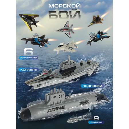 Игрушечный авианосец, подводная лодка, 6 истребителей, 9 снарядов для подводной лодки.