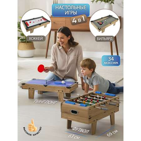 4 игры в одном наборе, детский настольный футбол, пинг понг, хоккей, мини бильярд для детей. Корпуса площадок из МДФ, подробная и понятная инструкция по сборке, все необходимые допэлементы для игр в комплекте, возможность собрать футбольную игровую площадку с ножками и без ножек. Биты с защитами для пальцев, можно вести счет, текстильное покрытие бильярдного стола. Экологически чистый материал МДФ, качественное исполнение, внимание к деталям, хорошее приобретение для дома, дачи или офиса. Отличная спортивная игра для детей и для всей семьи. Поможет в развитии важных навыков, станет замечательным подарком детям на Новый год и День рождения.
