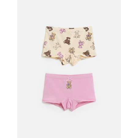 Сет из 2-х детских трусов-боксеров для девочки изготовлен из мягкого и эластичного хлопкового трикотажа с принтом. По линии пояса расположена эластичная резинка, обеспечивающая надежную и удобную посадку. На центральной части пояса нашит декоративный сатиновый бантик. Задняя деталь без центрального шва добавляет комфорта в ношении. Бежевая пара трусов полностью покрыта принтом с изображением медвежат, розовая с изображением одного медвежонка. Принт придает модели очаровательной нежности и понравится юной моднице. Модели прекрасно подходят для повседневного ношения, сочетая в себе стиль, качество и непревзойденный комфорт. 20224120070