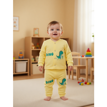 В этом комплекте ваш малыш будет выглядеть очаровательно. Он подчеркнет нежность и милоту вашего малыша. Комплект имеет принт с изображением доброго дракона Дино, что создает атмосферу новогоднего волшебства.