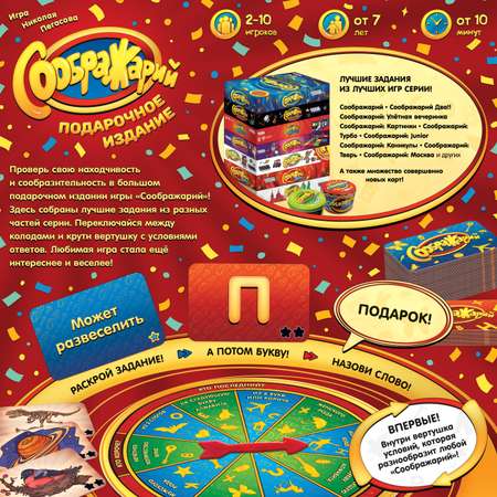 Сколько животных начинающихся на букву "К" вы знаете? Сможете ли за минуту назвать самое длинное слово на букву "Б"? А сколько товаров из супермаркета слов на букву "Ц" вы сможете вспомнить? Настольная игра "Соображарий" заставит вас задуматься! Она прекрасно подойдёт для шумных вечеринок или тихих семейных вечеров. Вспоминайте самые неординарные слова и победа будет в вашем кармане!