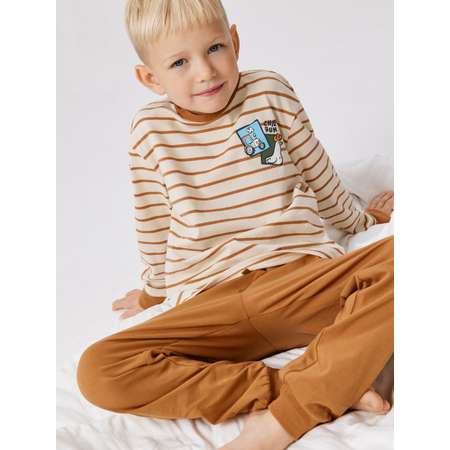 Детская пижама для мальчиков, выполненная из хлопкового трикотажного полотна, отлично подходит для длительного ношения. Пижамный комплект в бежевых оттенках состоит из лонгслива и прямых брюк. Лонгслив прямого силуэта со спущенной линией плеча комфортен в ношении, так как не стесняет движений и позволяет принять любую удобную для сна позу. Удобная округлая горловина контрастного цвета не мешает при одевании. Лонгслив в полоску украшен спереди принтом с надписью "CHILL BUM" [англ. - "Охладись"]. Пижама с длинным рукавом и манжетами по низу прекрасно подходит для холодного времени года. Брюки прямого силуэта с поясом на резинке удобно садятся на разные типы фигуры и дополнительно регулируются хлопковым шнуром. Расположенные по низу брючин манжеты обеспечивают плотное прилегание к телу и лучшее сохранение тепла. Пижама со штанами для мальчика станет прекрасным выбором для ночного сна, домашнего ношения или пижамной вечеринки с друзьями. 20124280057