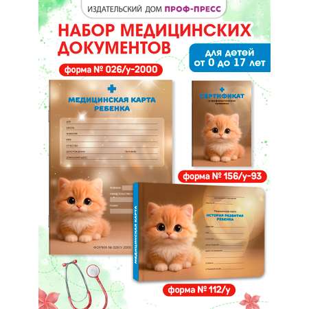 Медицинская карта Проф-Пресс 2 шт+прививочный сертификат. Набор медицинских документов. Рыжий котёнок