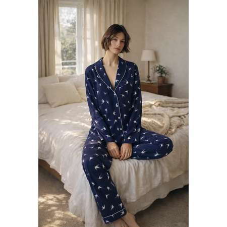 Пижамный комплект состоит из рубашки с длинным рукавом и удобных брюк прямого кроя. Классический пижамный фасон с застёжкой на пуговицы обеспечивает удобную посадку и свободу движений. Аккуратный воротник и декоративная окантовка придают модели элегантный и ухоженный вид, делая пижаму не только функциональной, но и эстетически привлекательной.