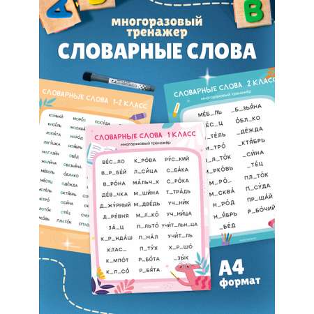 Тренажер представляет собой 3 двусторонних листа А4, покрытых плотной ламинацией. Один лист – информационный. Он содержит список словарных слов русского языка для 1-2 класса. Два остальных листа используются для тренировки. На них вы найдете примеры по теме с окошками для вписывания букв. За счет ламинации использовать такие листы можно многократно. Просто сотрите написанное и используйте снова. Маркер на водной основе идет в комплекте. Поставляется тренажер в брендированной коробке из плотного картона. Она защитит товар при транспортировке.