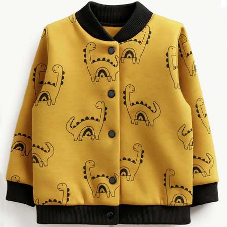 Детская толстовка-бомбер желтого цвета с принтом в виде динозавриков. Модель на кнопках, с манжетами и поясом в рубчик. Изготовлена из футера трехнитки с начесом (хлопок). Доступна в размерах 92-116.