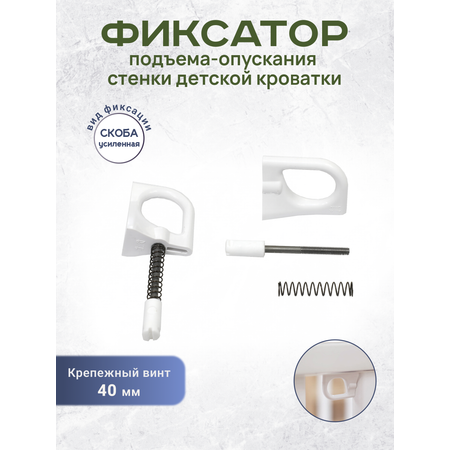 Фиксатор стенки детской кроватки Скоба усиленная. Предназначен для фиксации стенки кроватки для новорожденных одним движением . Устанавливается под верхнюю перекладину детской кроватки . Данный механизм предназначен если у Вашей кроватки у стенки опускается планка над стенкой. Фиксатор Скоба изготовлен из запатентованного высококачественного пластика , который используется только для производства запчастей детских кроваток . Механизм подъема опускания для детской кроватки нужен для опускания и поднимания планки-перекладины одним движением. В разработке сырья принимали участия отечественные ученые . Запчасть является 100 % производство Россия . Подходит для всех отечественных производителей кроваток для новорожденных, в которых предусмотрена данная система . Данный механизм Скоба автофиксации стенки детской кроватки популярна у производителя Лель , Кубаньлесстрой, Гандылян и другие . В комплект входят - скоба - 2 штуки., шток - 2 штуки., пружина. - 2 шт. Размер штока - длинна общая 50 мм ., , рабочий размер до наконечника 40 мм . ширина 4 мм .