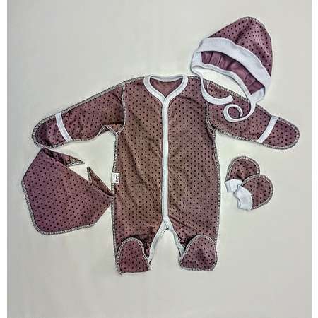Комплект одежды для новорожденного из гладкой кулирной глади ,состоит из 4 предметов.Набор подходит для малышей ростом 56 см,что соответствует 1- 2 месяцам.