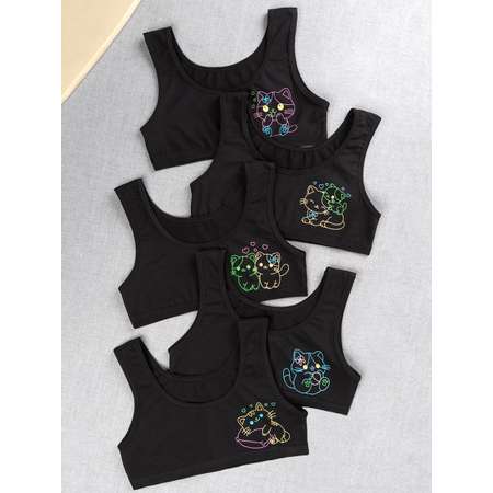 Набор бельевых топов для девочки и девочки подростка выполнен из мягкого трикотажного хлопка. В комплект входит 5 удобных моделей в черном цвете с рисунком Котики.