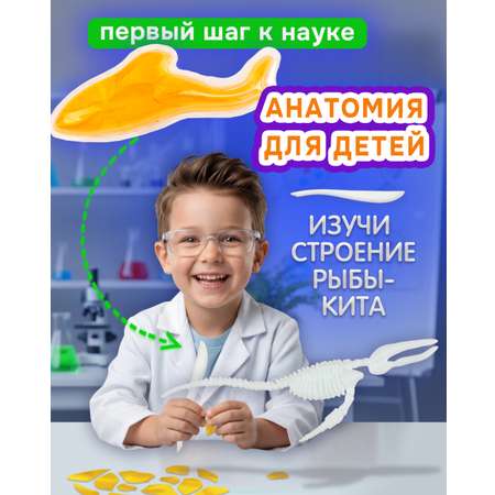 Набор для опытов Биосфера Кит от бренда 1TOY – это познавательная анатомия для детей в формате понятной и увлекательной игры. Анатомический набор включает пластиковый скальпель и прозрачный слайм со скелетом внутри. Набор опытов подходит для детей старше 5-ти лет.
