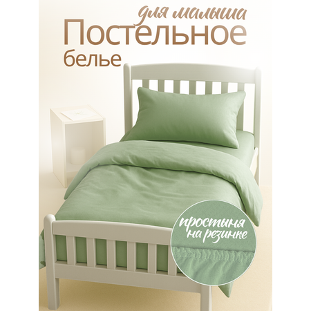 Постельное белье однотонное в кроватку для новорожденного с простыней на резинке, наволочка 40х60, ТМ Ночь Нежна Олива