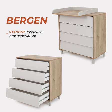 Эргономичный пеленальный комод Bergen, выполненный в трендовом стиле софт-минимализм, станет вашим надежным помощником с первых дней! Модель дополнена съемной накладкой для пеленания, усиленными телескопическими направляющими, эффектными наклонными фасадами.