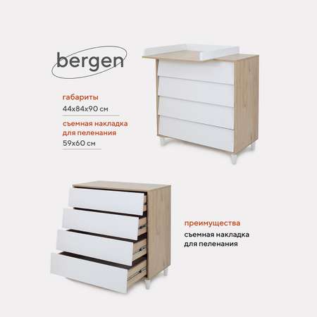 Эргономичный пеленальный комод Bergen, выполненный в трендовом стиле софт-минимализм, станет вашим надежным помощником с первых дней! Модель дополнена съемной накладкой для пеленания, усиленными телескопическими направляющими, эффектными наклонными фасадами.