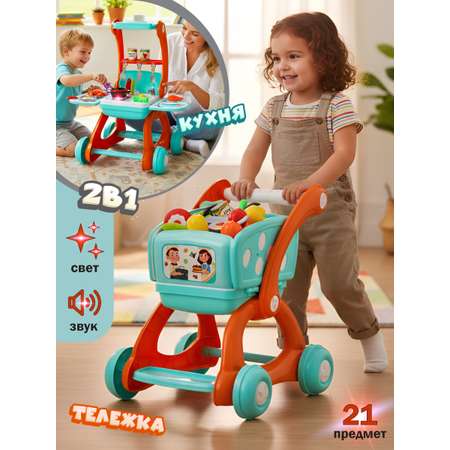 Игрушка 2 в 1, игрушечная тележка для супермаркета с продуктами и мини кухня. Конфорка со звуками жарки и закипания воды, возможность уменьшения и увеличения уровня громкости, красная подсветка конфорки у игрушечной плиты, раздельная фигурка краба на липучке, детская посуда кастрюля со съемной крышкой, у консервных банок открываются крышки, рукоятка крана вращается на 360 градусов. Детская мини тележка катается вперёд и назад, удобная для хвата ручка, в тележку можно сложить все игрушечные продукты, удобная система хранения, на корпусе кухни есть крючки и полочки, можно разместить продукты и кухонную утварь. Игровой набор изготовлен из прочных и долговечных материалов, отличается качественным исполнением, разнообразит сюжетно ролевые игры, станет прекрасным подарком детям.