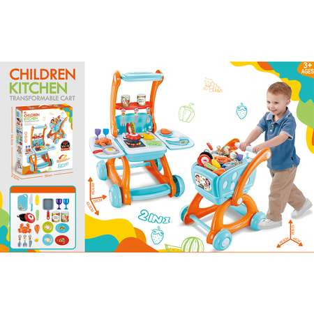 Игрушка 2 в 1, тележка и мини кухня. Конфорка со звуками жарки и закипания воды, возможность уменьшения и увеличения уровня громкости, красная подсветка конфорки, раздельная фигурка краба на липучке, кастрюля со съемной крышкой, у консервных банок открываются крышки, рукоятка крана вращается на 360 градусов. Тележка катается вперёд и назад, удобная для хвата ручка, в тележку можно сложить все предметы, удобная система хранения, на корпусе кухни есть крючки и полочки, можно разместить продукты и кухонную утварь. Игровой набор изготовлен из прочных и долговечных материалов в качественном исполнении.