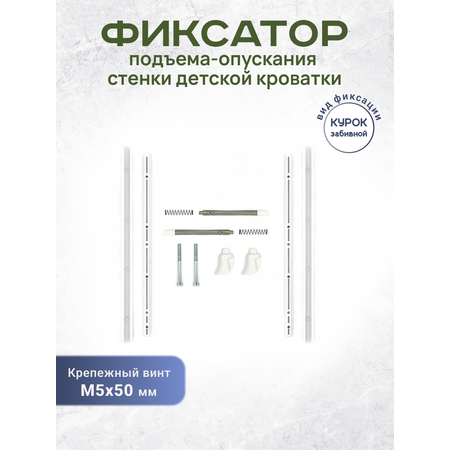 Механизм подъёма опускания передней стенки, планки для детской кроватки Курок. Предназначено для автостенок кроваток для новорожденных. Данный механизм предназначен для фиксации подъема или опускания передней стенки детской кроватки . Изготовлен из запатентованного высококачественного пластика , который используется только для производства запчастей детских кроваток . В разработке сырья принимали участия отечественные ученые .Запчасть является 100 % производство Россия . Подходит для всех отечественных производителей кроваток для новорожденных . В комплект входит : направляющие Т-образные - 2 штуки, направляющие «лодочка» - 2 штуки, шток - 2 штуки, курок - 2 штуки, пружина - 2 штуки, винт М5х50 - 2 штуки.