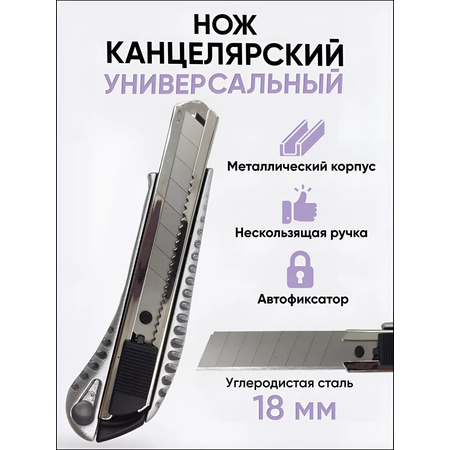 Ширина лезвия -18мм, поэтому оно с легкостью разрежет даже плотные материалы. Широкий канцелярский нож 18 мм имеет лезвие из углеродистой стали, поэтому отличается надежностью и прочностью. Оставляет ровный след без зазубрин, что важно при точной резке. Автоматический фиксатор длины выдвижного лезвия позволяет не деформироваться изделию при работе и обеспечивает отсутствие люфта. Режущая поверхность острого ножа ограничена металлическими направляющими, что гарантирует безопасность при использовании. Корпус товара серебристого цвета произведен также из металла, поэтому нож прослужит вам долгое время, рифленые края обеспечивают надежную фиксацию руки на инструменте. Канцелярская принадлежность не требует заточки – можно отломить затупившийся конец лезвия или использовать сменное. Нож для резки бумаги имеет эргономичный дизайн, поэтому будет сочетаться с любыми предметами канцелярии. Строительно-ремонтный нож поставляется в пластиковом блистере с европодвесом, поэтому вы можете хранить его, повесив на стену.