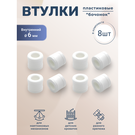 Втулка Бочонок маятникового механизма качания детской кроватки комплект 8 штук. Внешний диаметр 10 мм, внутренний диаметр 6 мм, длина 10 мм. Втулки Бочонок предназначены для обеспечения расстояния между механизмом качания детской кроватки и деталями маятника или механизмами подъема стенки . Тем самым создаётся расстояние между различными элементами, как результат, бесшумная работа всех механизмов. Втулка Бочонок для маятника детской кроватки изготовлена из запатентованного высококачественного пластика , который используется только для производства запчастей детских кроваток и комодов с пеленальным столиком . Так же используются при сборке электрооборудования, для фиксации крепежей и винтов .Ее внешний диаметр позволяет легко устанавливать ее в соответствующие отверстия. Внутренний диаметр втулки делает ее подходящей для различных осей, валов и других элементов. Длина втулки обеспечивает необходимую глубину установки. Изготовлена из прочного пластика, втулка обладает высокой износостойкостью и долгим сроком службы. Этот продукт идеально подходит для использования в производстве, ремонте или самодельных проектах. Запчасть является 100 % производство Россия .Размер втулки- внешний диаметр основания - 11,5 мм., внешний диаметр втулки - 10 мм., длина втулки - 10 мм., внутренний диаметр - 6 мм . Производство Россия