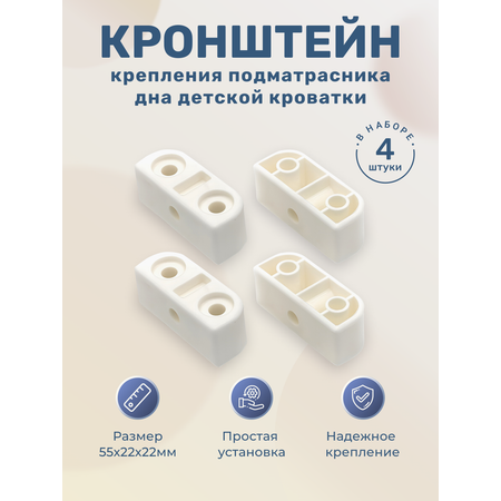 Кронштейн крепления подматрасника, дна для детской кроватки, комплект 4 штуки. Держатели дна детской кроватки изготовлены из запатентованного высококачественного пластика, который используется только для производства запчастей детских кроваток и комодов с пеленальным столиком. Так же используется для крепления различных полок, столешниц. Полкодержатель или кронштейн для полки- это важная деталь крепёжной системы, задача которой - удерживать и обеспечивать устойчивость полки. Устанавливается внутри шкафов и стенок. В разработке сырья принимали участия отечественные ученые. Запчасть является 100 % производство Россия. Держатель дна для кроватки новорожденным подходит для всех отечественных производителей кроваток для новорожденных. Предназначено для крепления дна кроватки для новорожденных, на любой высоте с помощью различных евровинтов (исходя из характеристик древесины вашей кроватки). Держатель дна для детской кроватки имеет два отверстия (межцентровое расстояние между ними 32 мм.) для фиксации держателя на стенках кроватки и 1 отверстие для фиксации дна под матрас. Фиксатор дна детской кроватки можно установить на любой высоте. Саморезы, болты - в комплект не входят. Размер- длина 58 мм., ширина 20 мм., высота 20 мм., межцентровое расстояние 32 мм. Нагрузка до 60 кг .