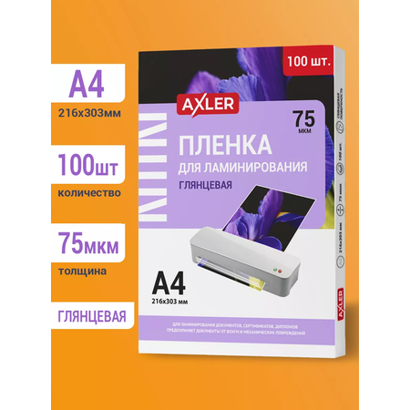 Пленки-заготовки для ламинирования А4, КОМПЛЕКТ 100 шт., 75 мкм, AXLER