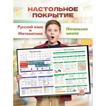Настольное покрытие размером 59х38 см. с принтом «Русский язык и математика. Начальная школа». Это непромокаемое покрытие с прозрачным откидным клапаном, внутрь которого помещен бумажный лист с набором наиболее важных правил начальной школы. Такой коврик удобно расположить на письменном столе ребёнка. Все нужные правила и формулы будут под рукой. Доставляется подложка для стола в плотном картонном конверте, который защищает её при транспортировке. Используйте покрытие как подарок на Новый год,выпускной или 1 сентября.