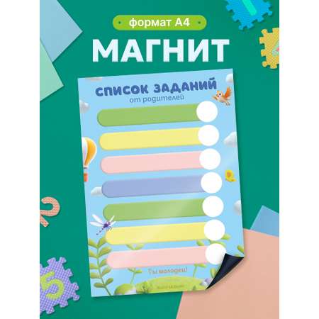 Магнитный планер "Список заданий от родителей" предназначен для детей. Крепится на холодильник или магнитно-маркерную доску. Он многоразовый (важно! Писать по планеру можно только маркером на водной основе) и станет первым тренажером ребенка в планировании, а также может стать стимулом для выполнения не особо любимых дел, например, уборки в комнате. Ведь выполнять всё "как взрослый", имея собственный планер, гораздо интереснее. Размер детского трекера - А4. Ищите подарок дочке, сыну или племянникам? Хотите, чтобы они стали собраннее и ответственнее? Присмотритесь к этому полезному планеру. Его дизайн подходит как для девочек, так и для мальчиков. Поставляется в коробке из плотного картона с презентабельным дизайном.
