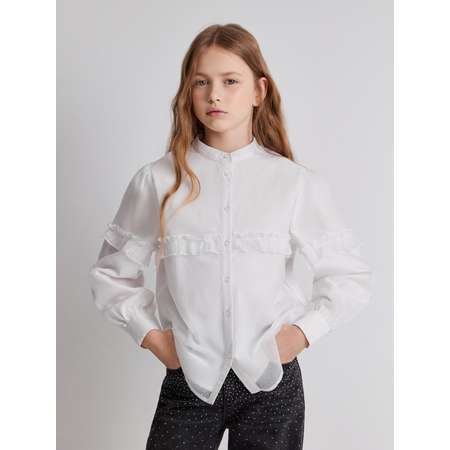 Блузка для девочки свободного силуэта на хлопковой подкладке. Верх изделия из полупрозрачного шифона. Рукав длинный объемный присборен по низу, манжета на петлю и пуговицу. Застежка расположена на центральной планке на пертли и пуговицы. Изделие декорировано рюшей спереди и на рукавах. 20210260147