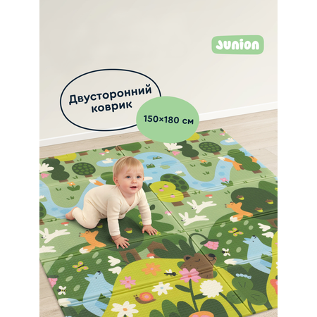 Коврик двусторонний: одна сторона с лесным сюжетом помогает изучать цвета, животных, растения и формы, другая — со спокойным рисунком, который впишется в любой интерьер. После игр коврик легко помыть и компактно сложить для хранения.