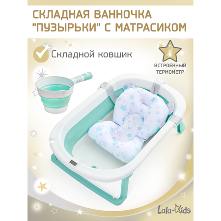 Цена на Ванночка LaLa-Kids Звезды изумрудные + ковш с матрасиком, складная зеленый - 3904 ₽.