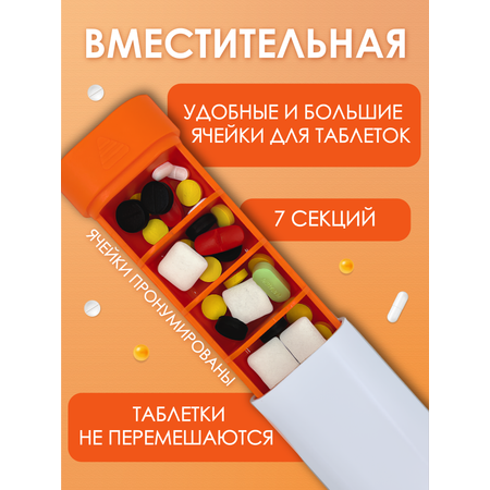 Кейс изготовлен из пластика, который надежно защищает содержимое от влаги и рассыпания. Удобные деления коробки позволяют быстро находить нужные таблетки, а герметичная упаковка с удобным механизмом открывания гарантирует сохранность лекарств даже в поездках.