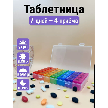 Таблетница на неделю 4 приема от Axler Home - это практичная замена ящикам и коробкам домашней аптечки. Это компактная и красивая емкость для хранения таблеток, витаминов, медикаментов и других лекарственных изделий. Многофункциональная мини пилюльница незаменима для взрослых - мужчин и женщин, а также пожилых людей, которые заботятся о своем здоровье. Таблетница для лекарств на 7 дней изготовлена из прочного и безопасного пластика и полипропилена, поэтому она отличается прочностью и подойдет даже для детей. Витаминница состоит из 7 выдвижных отсеков на каждый день с разделением на 4 секции - по времени суток: утро, день, вечер, ночь. Коробочка удобна в использовании, потому что все отделения имеют надписи на русском языке. Контейнер органайзер для таблеток на неделю имеет крышку, что позволит исключить рассыпание и потерю лекарственных средств. Кейс нужно заполнять всего раз в неделю, в месяц - 4 раза, что позволит сэкономить ваше время. Таблеточница бокс для таблеток оснащена разборным футляром, поэтому ее можно брать с собой целиком или отдельными ячейками с прозрачной крышкой. Они легко поместятся в кармане, чемодане, женской или спортивной сумке. Берите карманный бокс с собой на работу, в дорогу, путешествие на поезде или самолете, чтобы не пропускать ежедневный прием важных препаратов. Недельный кейс для лекарств - хорошее дополнение к женскому, мужскому и детскому подарку. Если вам нужен футляр для таблеток, выбирайте продукцию Акслер Хоум.