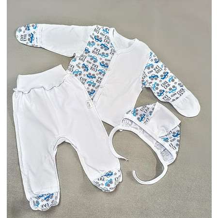 Комплект для новорожденного из кулирной глади состоящий из кофточки с рукавом -трансформером,можно закрыть и открыть ручку,ползунков на еврорезинке , чепчика - шлемика. Все швы выполнены наружу для максимального комфорта малыша. Комплект изготовлен из 100% хлопка.