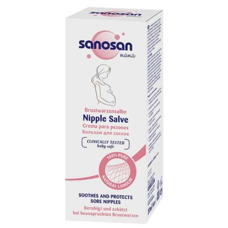 sanosan Бальзам для сосков - 100% ланолина в составе, который ухаживает за чувствительной кожей сосков. Применяют при трещинах и для ухода за грудью в период беременности и кормления.