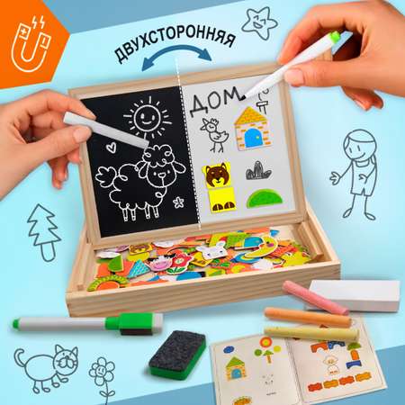 - Для этого в набор входят: двухсторонняя магнитно-меловая доска, 65 классных магнитных пазлов, которые точно порадуют ребёнка, маркер, ластик для удаления маркера, разноцветные мелки, инструкция. Всё это объединено любимой темой «Домашние животные» и укомплектовано в прочный деревянный кейс, который одновременно организует волшебное рабочее пространство юного дарования и помогает содержать набор в идеальном порядке.