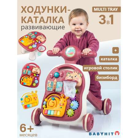 Ходунки — каталка 3в1 с бизибордом станет отличным выбором в качестве развивающей игрушки для малышей, которые начинают вставать на ножки! Мультифункциональная модель Multi Tray от бренда «Babyhit» легко трансформируется в игровой столик с разными подвижными элементами, которые ребенку интересно трогать и разглядывать. Игрушка помогает научиться ходить и закрепить новые двигательные навыки. Она способствует развитию мелкой моторики и сенсорного восприятия. Детская каталка поддерживает три способа игры — «сидим и играем», «стоим и ходим» и «стоим и играем». Она сделано из прочного и безопасного пластика. Продуманная конструкция имеет ручки для удобного хвата с возможностью регулировки высоты в 2-х положениях. Она подходит для домашних игр и уличных прогулок. Ходули с бизибордом станут замечательным приобретением для маленьких мальчиков и девочек, начинающих ходить. Они рассчитаны на деток в возрасте от 9 месяцев. Это настоящий многофункциональный развивающий игровой центр, который можно приобрести в качестве подарка для мальчика или девочки. Съемная интерактивная панель включает тактильно приятные шестеренки, книжку с картинками, баскетбольное кольцо с шариками и съемную игрушку-улитку. Игрушка-улитка со звуковыми эффектами работает на 2-х батарейках типа АА (нет в комплекте).