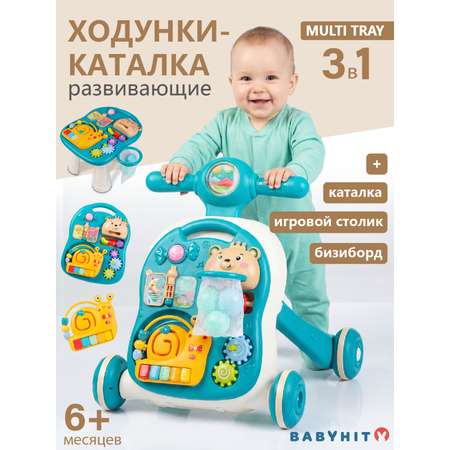 Ходунки — каталка 3в1 с бизибордом станет отличным выбором в качестве развивающей игрушки для малышей, которые начинают вставать на ножки! Мультифункциональная модель Multi Tray от бренда «Babyhit» легко трансформируется в игровой столик с разными подвижными элементами, которые ребенку интересно трогать и разглядывать. Игрушка помогает научиться ходить и закрепить новые двигательные навыки. Она способствует развитию мелкой моторики и сенсорного восприятия. Детская каталка поддерживает три способа игры — «сидим и играем», «стоим и ходим» и «стоим и играем». Она сделано из прочного и безопасного пластика. Продуманная конструкция имеет ручки для удобного хвата с возможностью регулировки высоты в 2-х положениях. Она подходит для домашних игр и уличных прогулок. Ходули с бизибордом станут замечательным приобретением для маленьких мальчиков и девочек, начинающих ходить. Они рассчитаны на деток в возрасте от 9 месяцев. Это настоящий многофункциональный развивающий игровой центр, который можно приобрести в качестве подарка для мальчика или девочки. Съемная интерактивная панель включает тактильно приятные шестеренки, книжку с картинками, баскетбольное кольцо с шариками и съемную игрушку-улитку. Игрушка-улитка со звуковыми эффектами работает на 2-х батарейках типа АА (нет в комплекте).